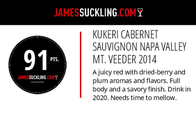 2014 Kukeri Mt. Veeder Cabernet Sauvignon - A juice red with dried berry and plum aromas and flavors. Full body and savory finish. Drink in 2020. Need time to mellow - 91pts.